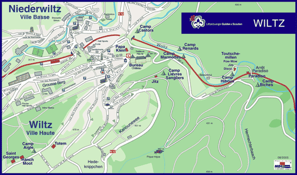 Kaartje waarop de kampeerterreinen en blokhutten in Wiltz zijn aangegeven